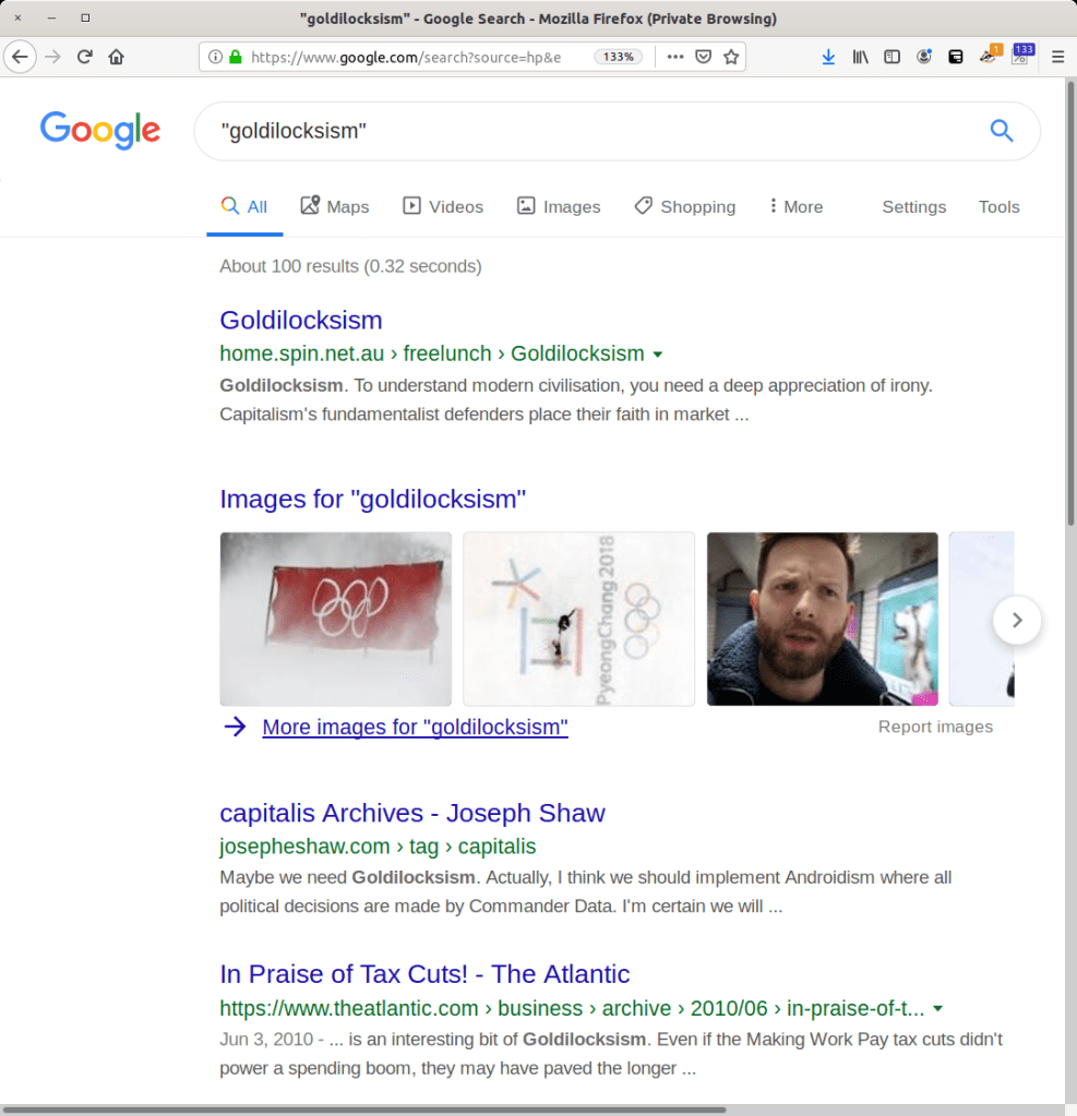 I should explain here what Goldilocksism is. For now, you will have to do with a google search screenshot that shows that I didn’t invent this term. It has been used before.